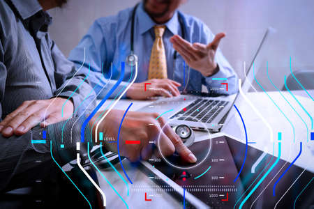 Health care and medical services with circular AR diagram record.Medical technology network team meeting concept. Doctor hand working smart phone modern digital tablet laptop computer graphics chart interface, sun flare effect photo