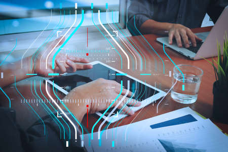 Business data analytics process management diagram.top view of two colleagues discussing data with blank screen new modern computer laptop and pro digital tablet on wooden desk as concept