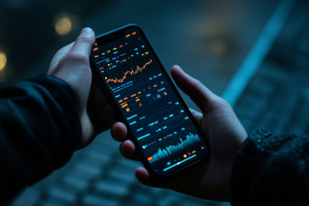 A person checks stock market data on a smartphone while standing in a dimly lit urban environment at night