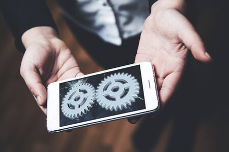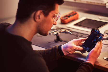 Technician repairing a mobile phone in the workshop. Smartphone repair service.