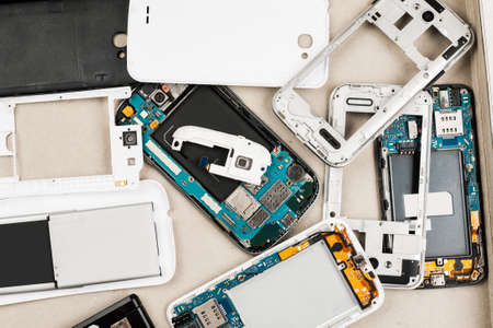 A detailed flat lay of disassembled smartphone components showcasing various parts such as the circuit, camera, and battery, ideal for technology exploration.