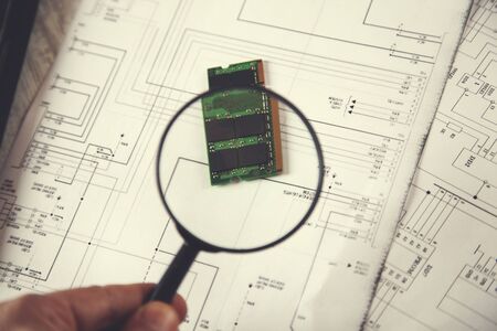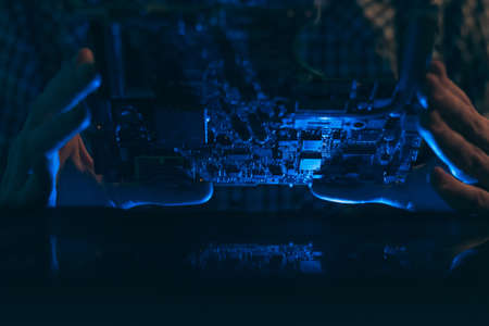 computer hardware development. microelectronics technology science concept. engineer holding a computer component