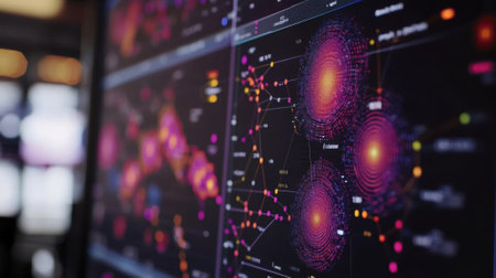 Big data analysis showing colorful circular diagrams on multiple computer screens