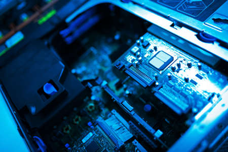 A detailed view of an electronic circuit board illuminated with vibrant blue and purple light.