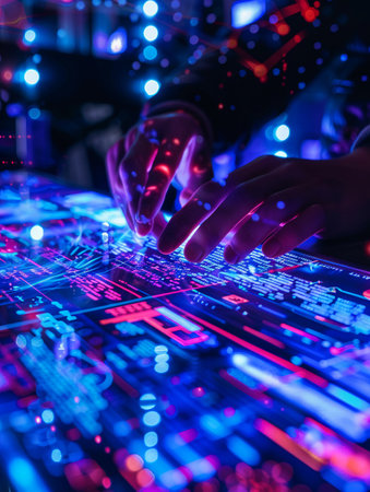 An electronic circuit board and various components are showcased, illuminated by a combination of red and blue light. The image highlights a complex arrangement of wires, panels, and equipment, indicating a possible laboratory or workshop setting. This composition may be suitable for illustrating technology, innovation, or research concepts in commercial contexts.