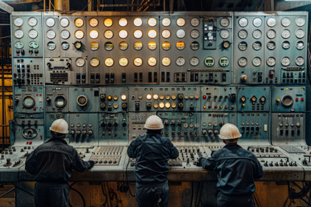 Engineers Working on a Large Control Panel in a Power Plant. AI generative