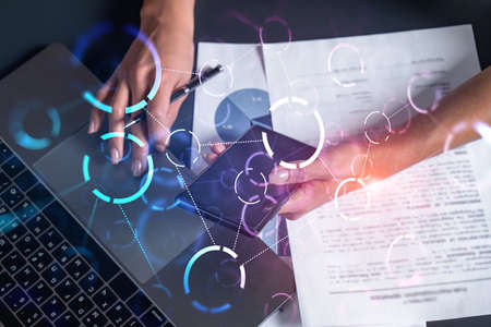 Abstract moder technology theme hologram and a woman signing contract use phone. Multiexposure.