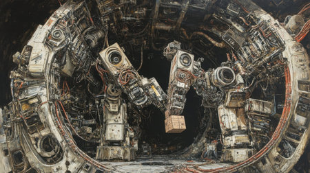 This visually striking image showcases intricate robot arms within an industrial facility. The background features a complex array of machinery, highlighting advanced technology and automation at work.