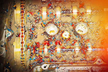 Moor carbonization, detail on disassembled car engine and mosaic structure.