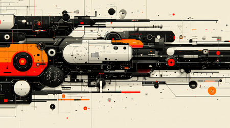 This abstract artwork features a dynamic composition of geometric shapes and lines in black and orange tones, capturing a futuristic aesthetic.
