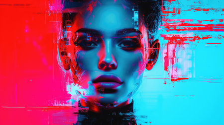Futuristic abstract portrait of smart woman looking at camera with digital glitch with vibrant neon light. Young beautiful female staring at camera represent digital robotic simulated human. AIG42.