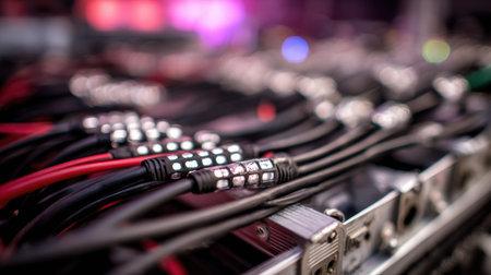 Cables and lighting hardware are organized for a technical event setup, showing details of connections in a venue environment.