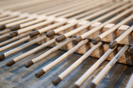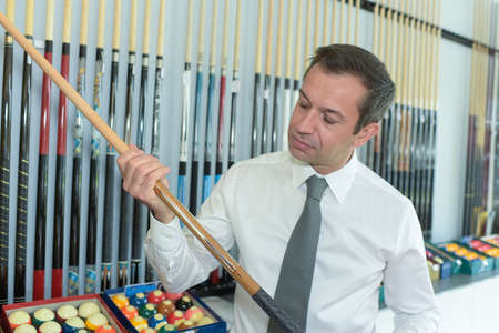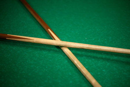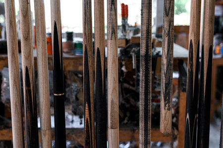 Building Pool Cue, Close-up Snookers Cue hanging in the workplace of craftsmanship wood factory. Soft focusing on the front cue.