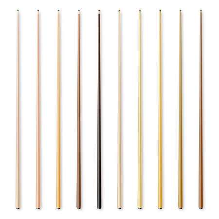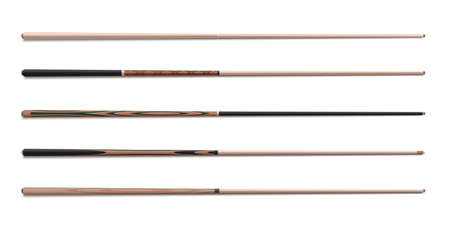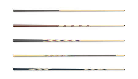 Various wooden billiard cues isolated on white background. Snooker sports equipment. Vintage pool cue. Active recreation and entertainment. Vector illustration