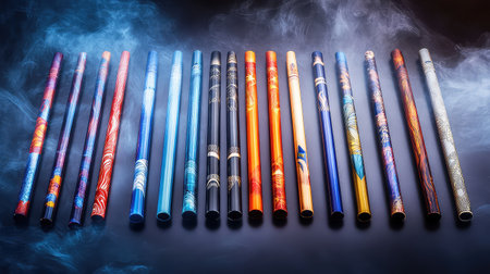 A stunning display of colorful artistic pens featuring unique designs set against a dramatic dark background. Perfect for creative projects.