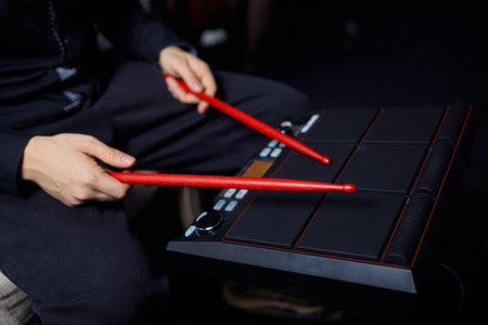 Percussion artist practicing. Electric drum sticks hitting textured surface. Performer using red drumsticks to craft rhythmic electronic sounds during rehearsal session