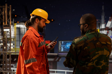 Military unit on offshore rig monitoring artificial intelligence defense systems with laptop. Soldier provides protection to drilling barge using AI machine learning surveillance systems