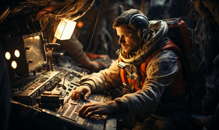 young man astronaut sitting inside space ship or international station with laptop or console with control panel, male engineer and cosmos science research and exploration. High quality photo