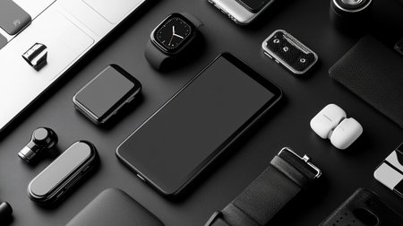 A black and white photograph depicting a diverse assortment of electronic devices neatly arranged, Monochromic, simplistic array of AI devices, AI Generated