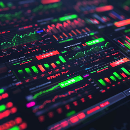 Intricate trading analytics display lively graphs and charts reflecting trading activity and stock price movements during market hours.