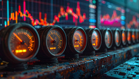 A row of vintage industrial gauges glows with warm intensity, actively monitoring the volatile fluctuations of a complex data chart displayed in the background.