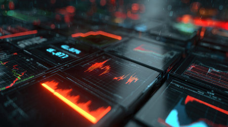 Close up of a vibrant financial data dashboard with dynamic charts and graphs on a digital screen