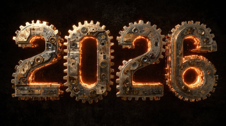 2026 displayed in steampunk style with metallic gears and glowing elements, creating futuristic and industrial feel. intricate design showcases creativity and innovation