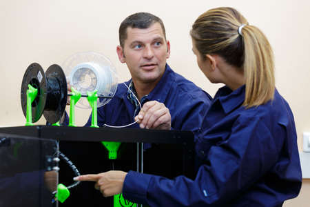 Product design engineer collaborates with industrial designer on 3D printing project in engineering workspace. Interdisciplinary teamwork, innovation, design and engineering in product development