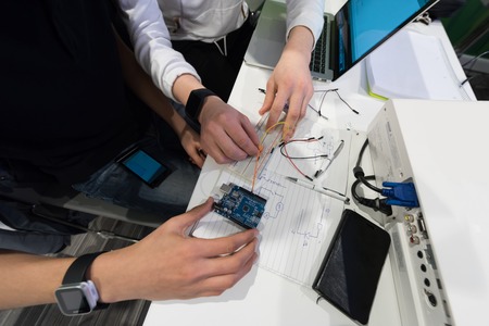 Electronics engineering according to scheme. Electricians creating electronic construction on workplace with special components with wiring diagram