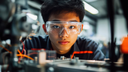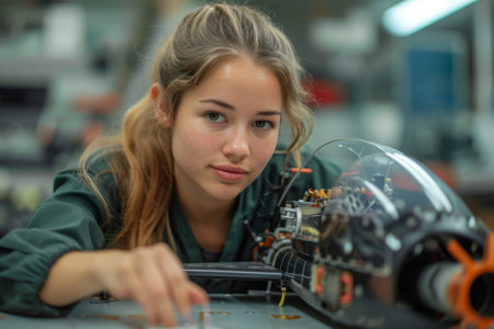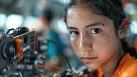 The close up picture of the hispanic girl participating in robotics or mechanic competition, robotics competition require robotics knowledge and skills, focus and concentration, adaptability . AIG43.