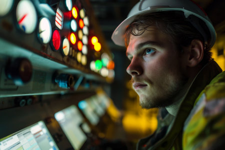 Young african american sailor working at control panel of ship or submarine, adjusting knobs and switches, focused on task