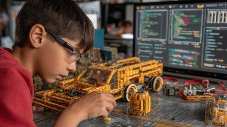 A young boy concentrates as he assembles a colorful model using construction blocks in a tech workspace, surrounded by code on a screen.
