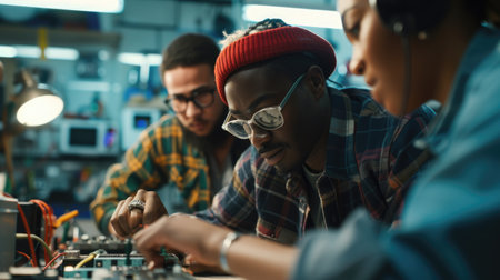 Young engineering students collaborate on an electronics project in a technology lab, soldering circuit boards and sharing ideas. AIG41