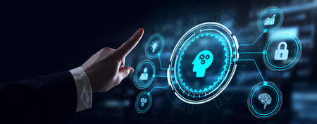 Machine learning technology diagram with artificial intelligence (AI),neural network,automation,data mining in VR screen.Team brainstorming task. Photo young creative managers crew working with new startup project.