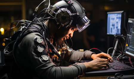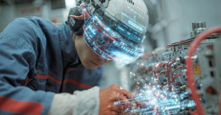 A worker wearing an augmented reality headset repairs machinery, with glowing holographic data and a digital interface floating around his head and hands.