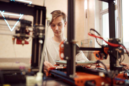 Young man working at laptop. 3d printing concept