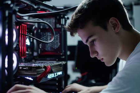 A teenager is deeply focused on assembling a computer, surrounded by electronic components in a dark room.