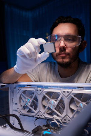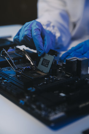 Man repairing CPU board of a computer. IT specialist, fixing hardware. Professional service.