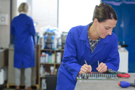 Electrical engineer assembling components in electronics factory