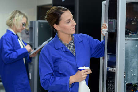 Female IT technician in her 30s repairs a server inside a computer lab with tools