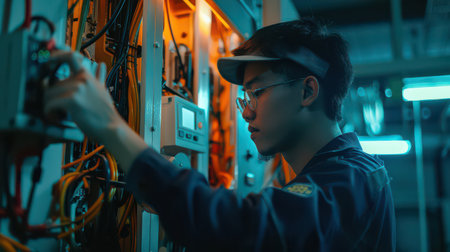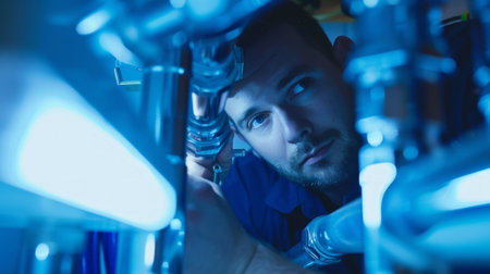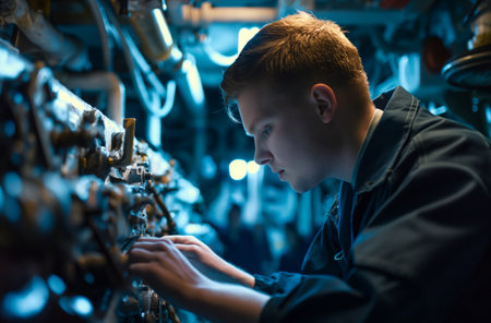 Young male engineer inspects complex machinery aboard a submarine, illuminated by blue lights
