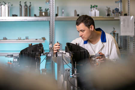 engineer measures plastic components for the production of lights for the automotive industry in a factory on a digital 3D machine