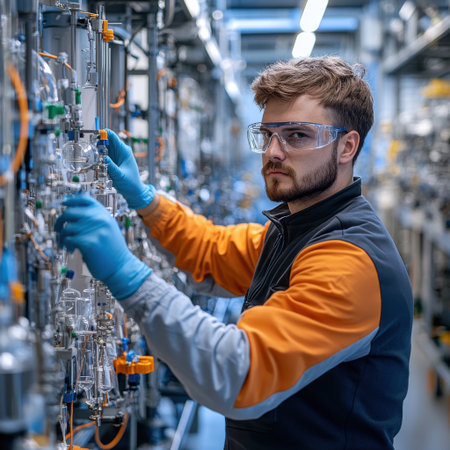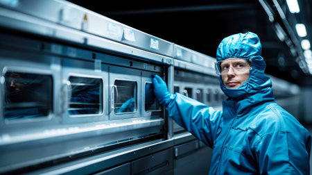 A technician in protective gear is carefully monitoring and adjusting laboratory equipment.