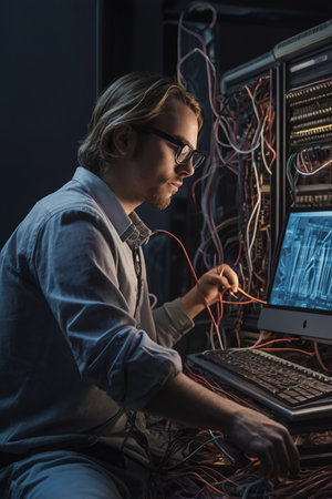 portrait of technician repairing broken computer in server room at low angle