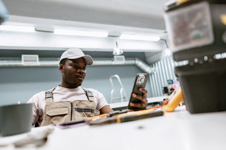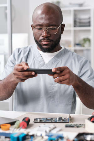Young repairman of African ethnicity holding smartphone over hardware while sitting by workplace