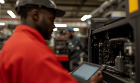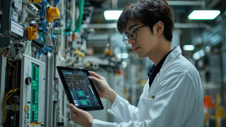 Automation engineer testing smart factory systems with a tablet displaying control settings