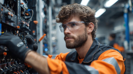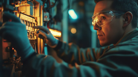 A focused female engineer inspects electrical equipment in a modern laboratory setting, showcasing safety features like goggles and gloves while working meticulously on the machinery.