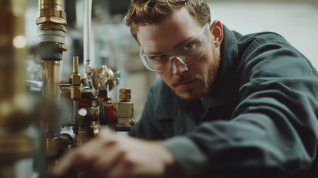 Mechanic repairing industrial plumbing system with safety glasses and tools in close up photo