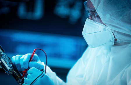 The scientist works in a modern scientific laboratory for the research and development of microelectronics and processors. Microprocessor manufacturing worker uses computer technology and equipment.