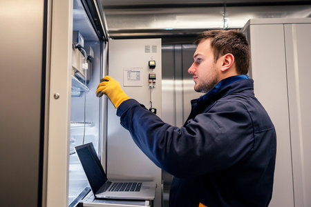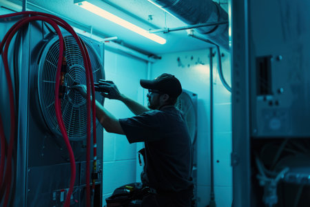 Worker checking an industrial air conditioning unit, adjusting valves and controls. Generative AI